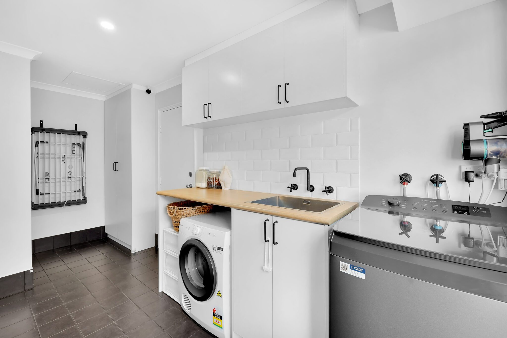 • Functional laundry with upgraded benchtop, linen storage and overhead cabinetry