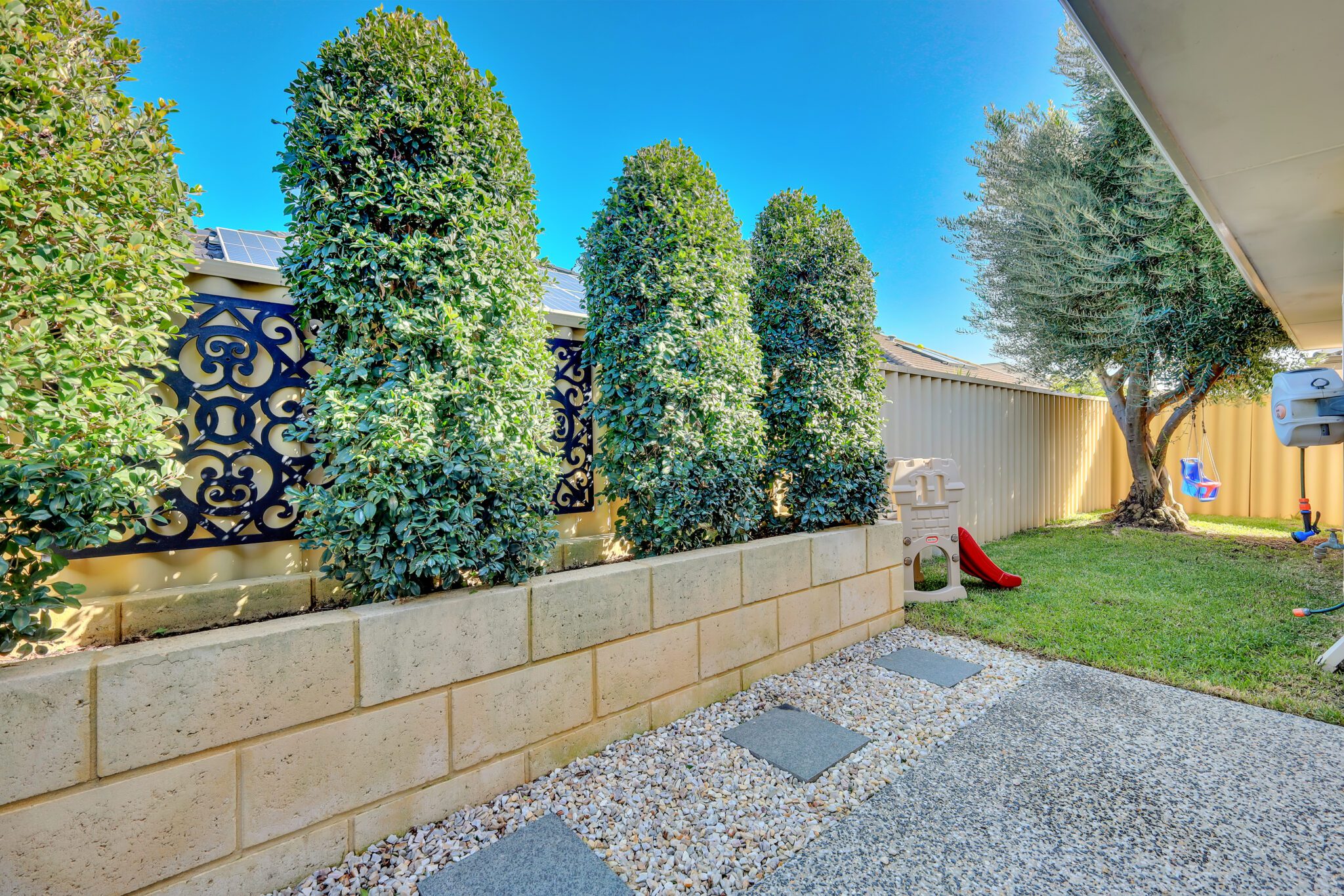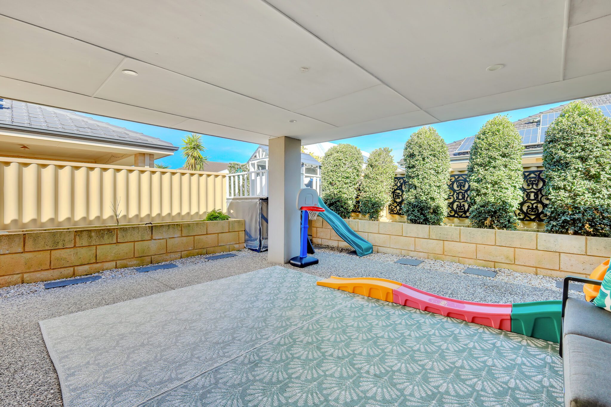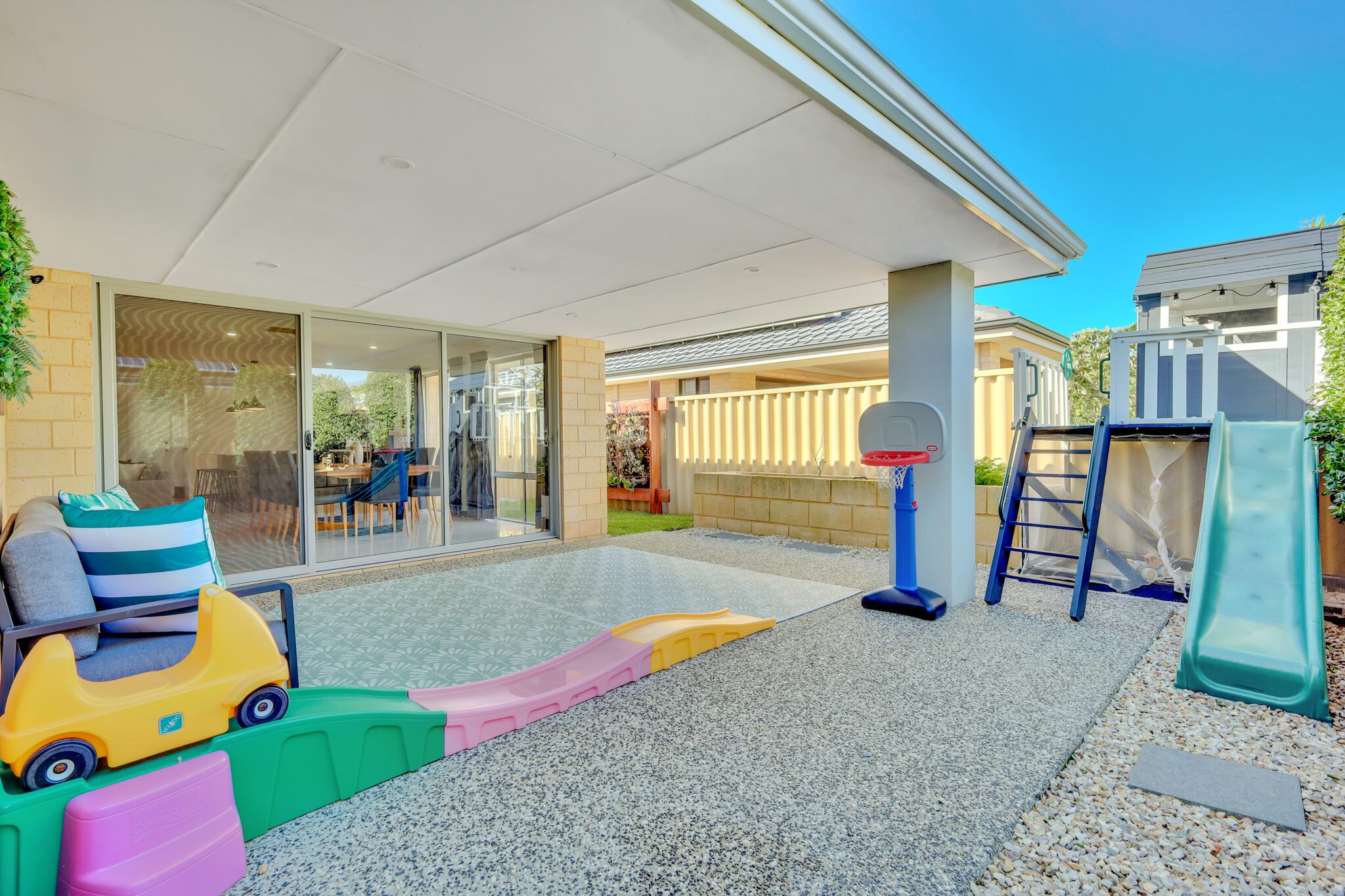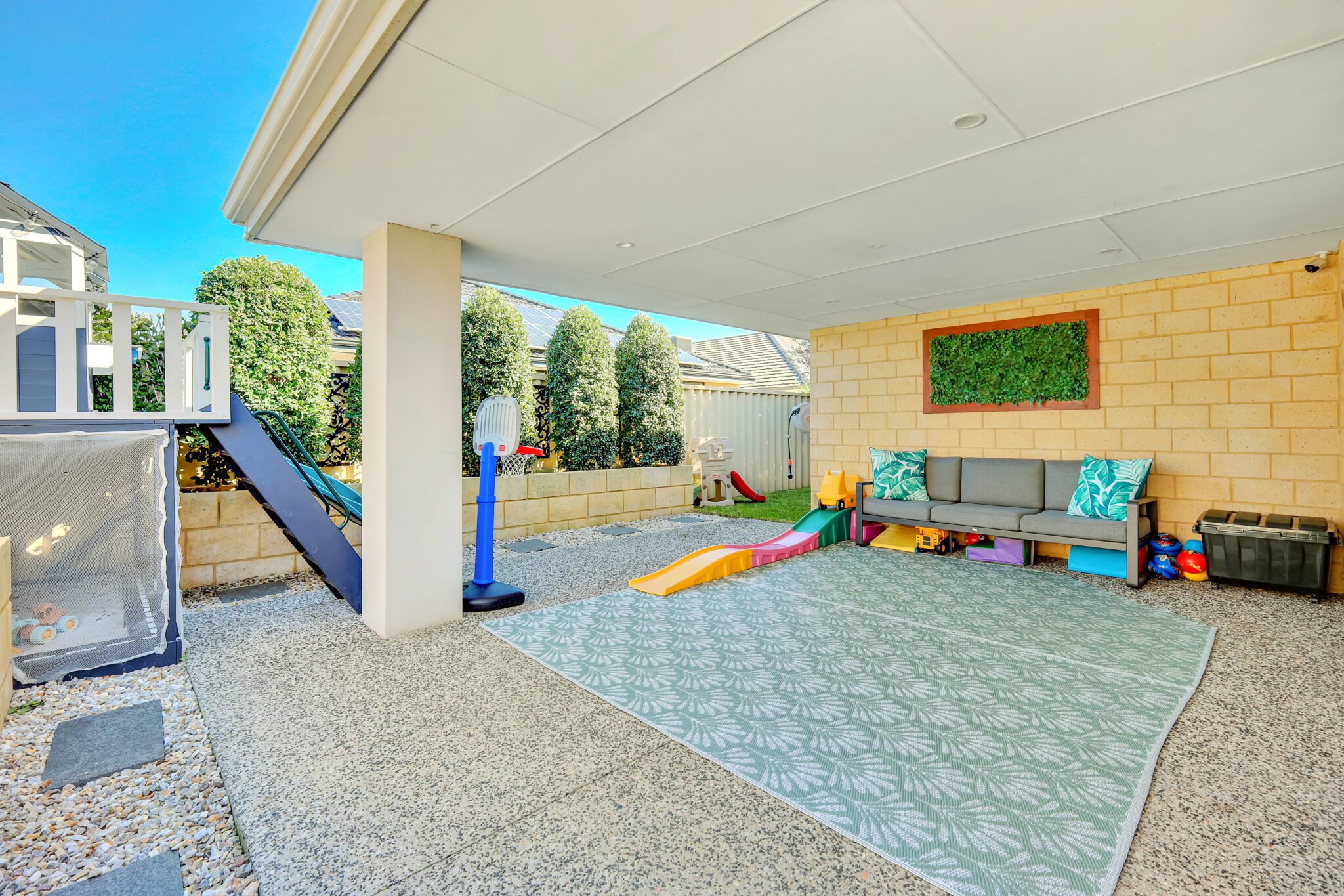 A dedicated play area with a built-in kids’ cubby house brings joy and adventure to the backyard. A fantastic bonus for families with young children.