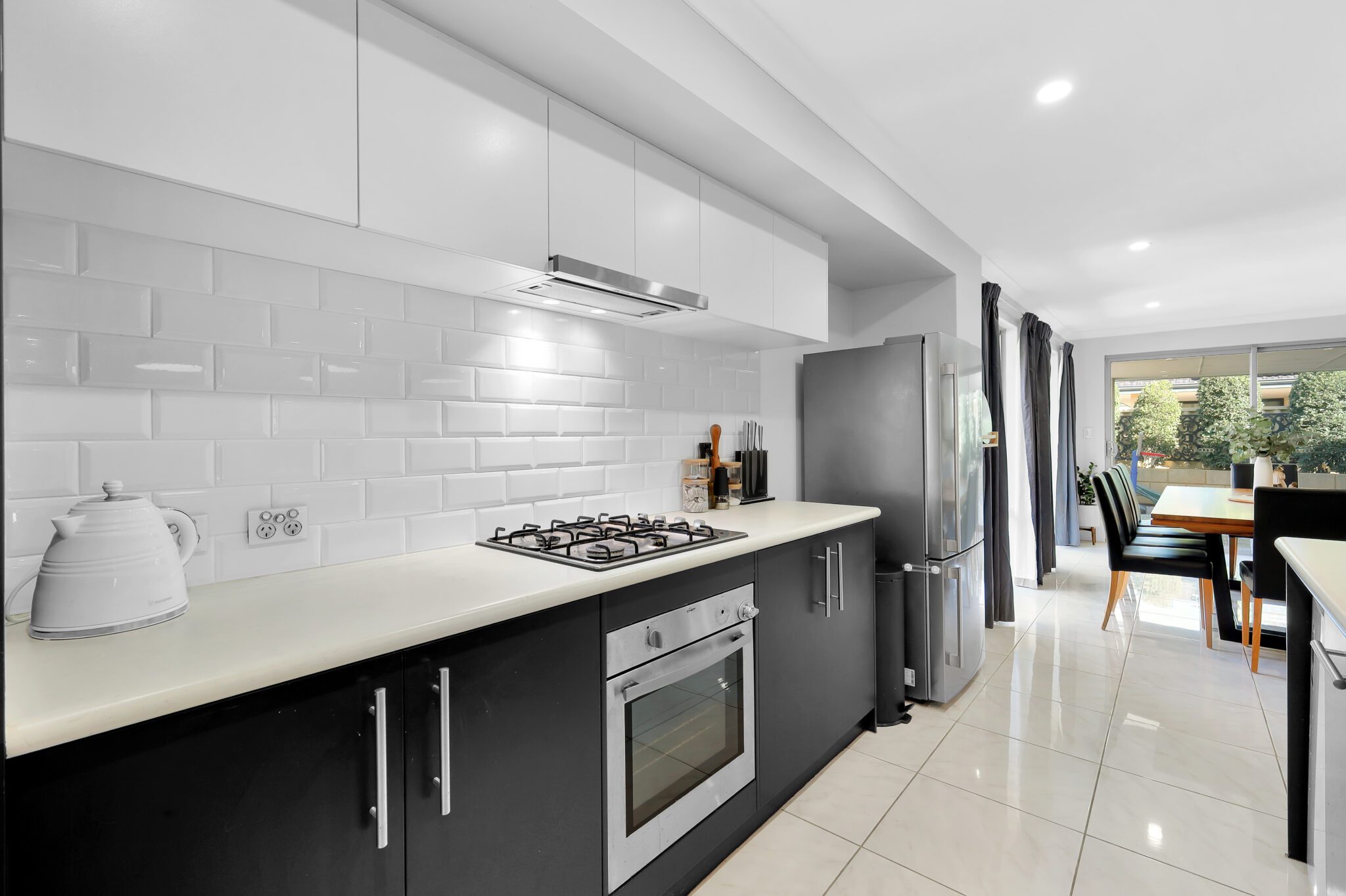 The kitchen is integral to an open-plan living space, connecting to the dining and living areas. This sleek, modern kitchen boasts overhead cupboards, a Gas cooktop, a Stainless steel range hood, a Double sink, and a dishwasher recess- offering abundant storage and prep space. The kitchen is the heart of the whole house, keeping the family together.