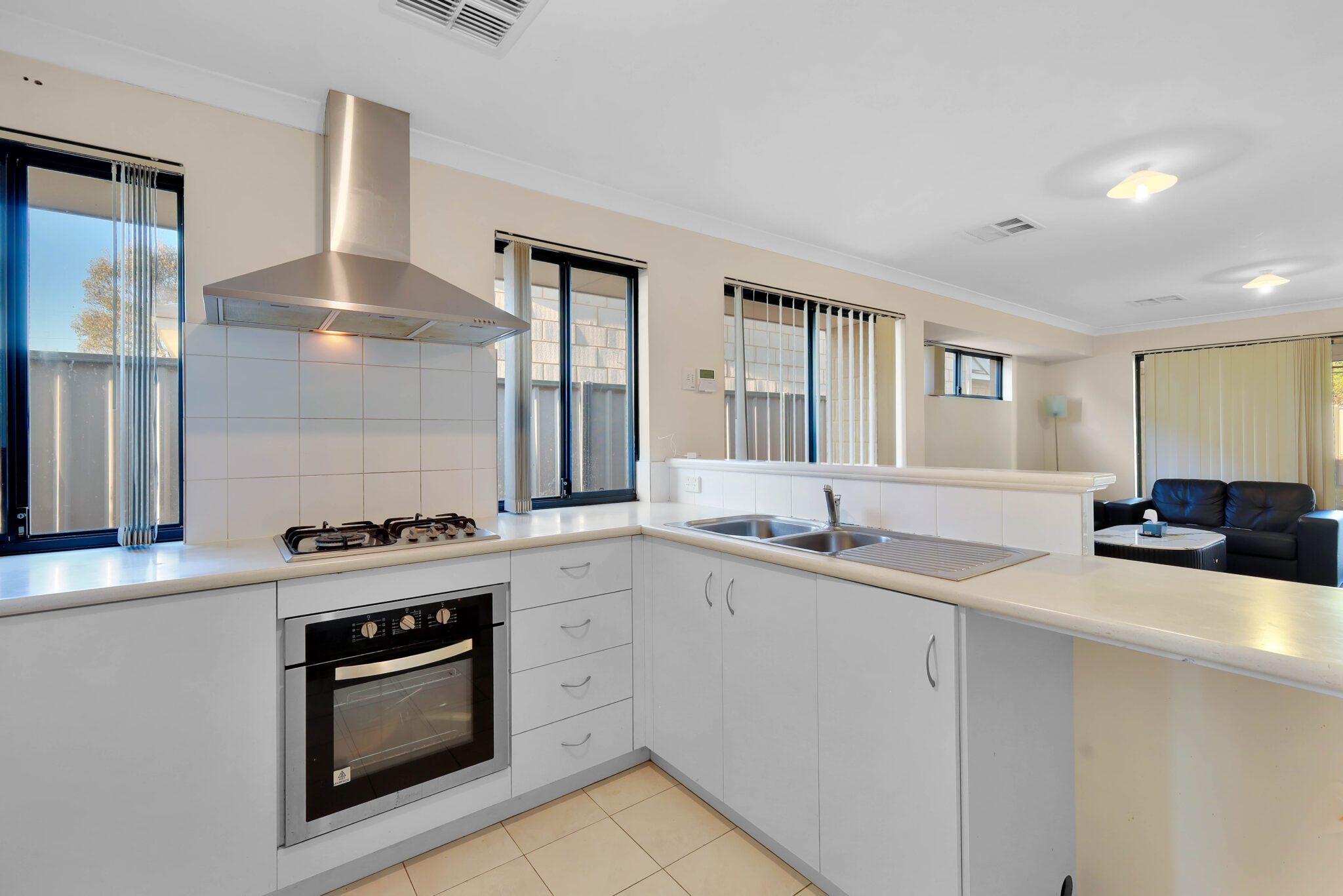 It features a gas cooktop, rangehood, and double sink, along with ample bench and cupboard space